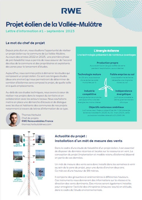 La première lettre d’information a été distribuée en septembre lors de l’installation du mât de mesure.