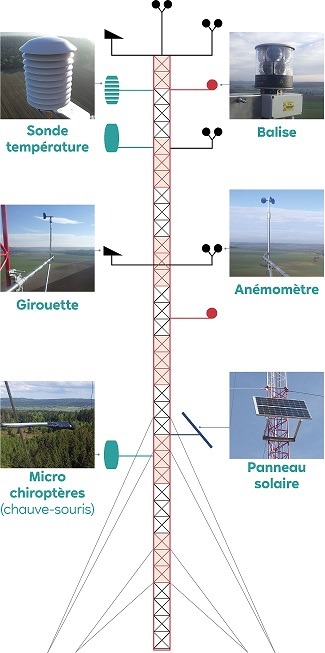 Un mât de mesure a été installé en septembre 2023 afin de recueillir des données locales. Ce mât de mesure, d’une hauteur d’environ 120 mètres, est équipé de plusieurs types d’instruments de mesures, à différentes hauteurs : des girouettes (direction du vent) et anémomètres (vitesse du vent). Des micros à ultra-sons y seront également installés durant certaines périodes de l’année, afin de compléter les données de l’étude faune et flore sur l’activité des chauves-souris en altitude.